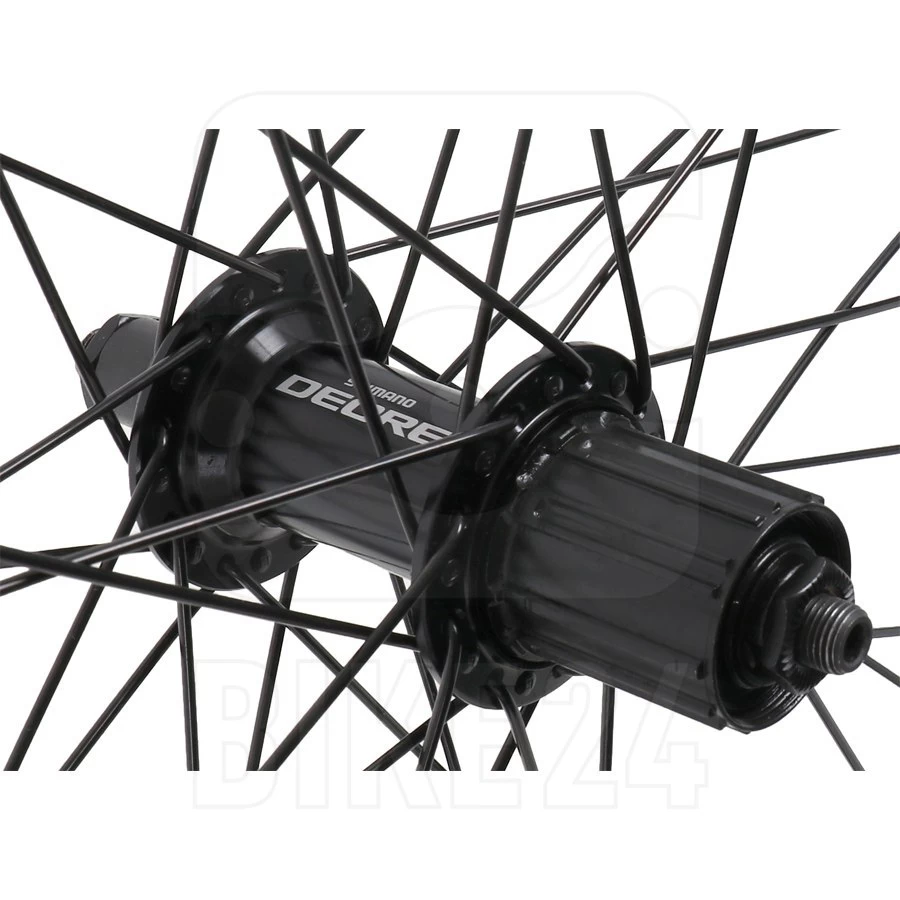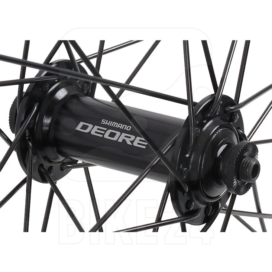 The Shimano Deore T610 hubs for rim brakes feature labyrinth seals. Adjustable angular contact bearings guarantee smooth rolling characteristics and long durability. Rear hub is equipped with a lightweight freewheel body.